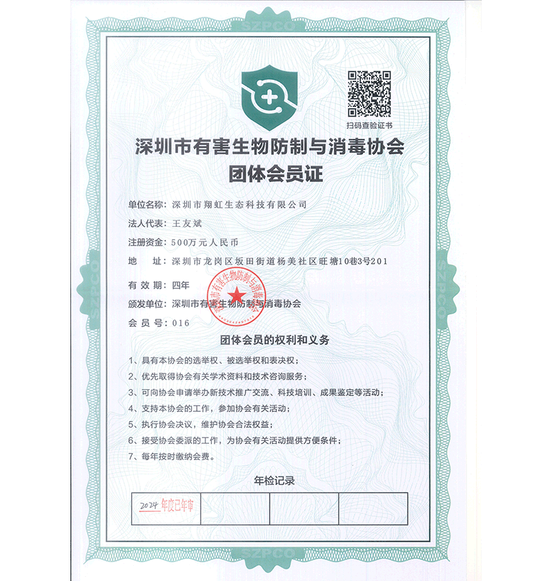 深圳市翔虹生態科技有限公司成立于1995年,是深圳最早成立的專業蟲害防治公司之一。公司發展至今獲得全國有害生物防制服務A級資質、廣東省有害生物防制服務A級資質、深圳市有害生物防制服務A級資質、廣東省有害生物防制服務A級資質、深圳市有害生物防制服務甲級資質的單位,是中國有害生物防治協會會員、廣東省有害生物防治協會會員、深圳市有害生物防治協會理事單位,多次獲得“深圳市十佳消殺單位”榮譽。